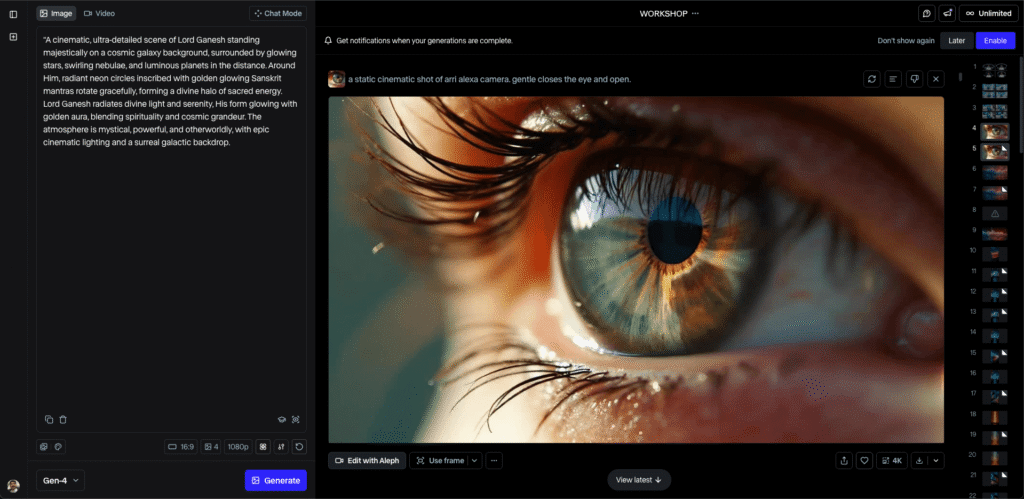 - Runway ML works best when you give very detailed prompts(not just “close-up of an eye”).