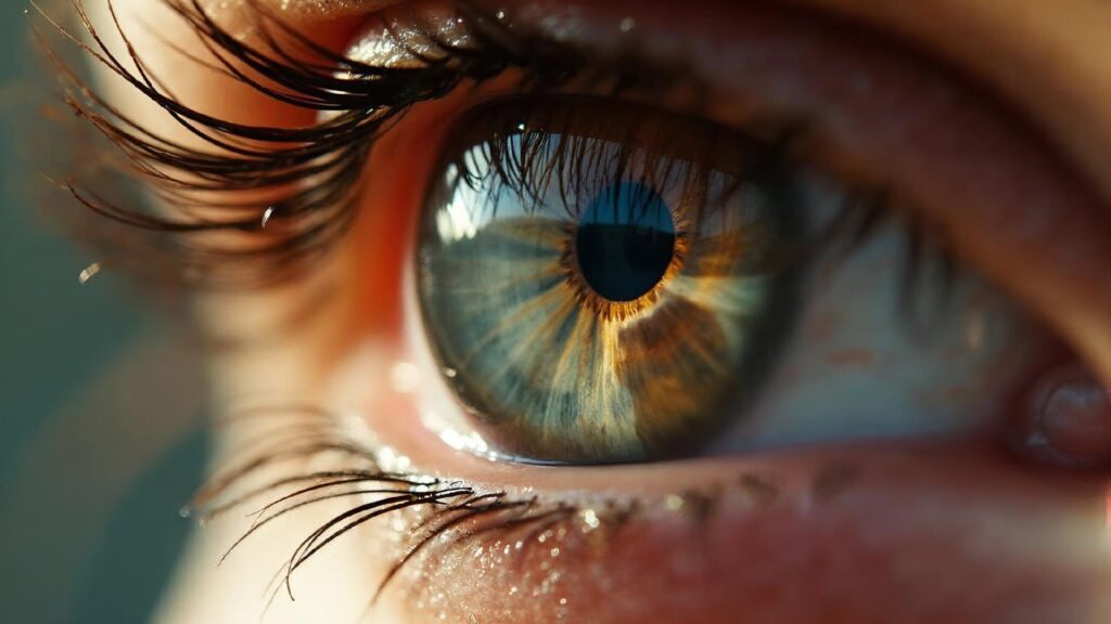 “An ultra photo-realistic extreme close-up (macro) shot of a human eye. The iris is vibrant with shades of blue, green, and amber radiating outward, with visible fiber-like textures and intricate reflections. Long, sharp eyelashes frame the eye, with skin pores and tiny details around the eyelid visible in natural tones. The cornea reflects subtle natural light, creating a luminous effect. Captured with a Canon EOS R5 + 100mm f/2.8L Macro Lens, aperture f/4, focal length 100mm, ISO 200, shutter speed 1/200 sec. Depth of field is shallow, focusing only on the iris and eyelashes, background softly blurred (bokeh). Hyper-realistic detailing, 8K resolution, cinematic lighting with soft highlights and shadows.”